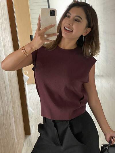 Top tricoté sans manches de couleur unie avec col pour femmes-51%