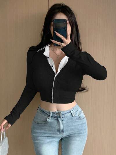 Chemise femme à col rabattu de couleur unie et longueur courte, manches longues. Vêtements de rentrée scolaire, hauts courts pour femmes