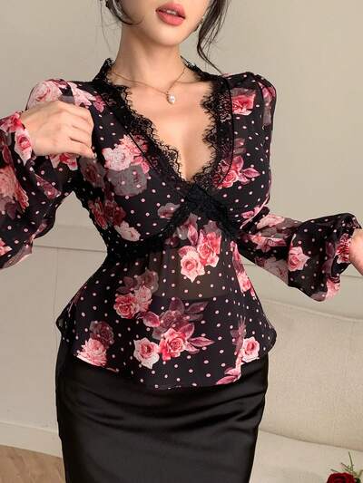 Blouse noire à fleurs marguerite avec bordure en dentelle, col V, taille cintrée, manches longues bouffantes. Décontractée, pour les vacances, tenue de travail pour femmes