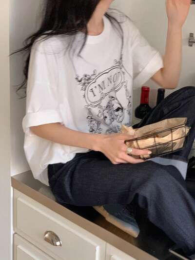 T-shirt décontracté à manches courtes imprimé, col rond, oversize pour femmes-37%