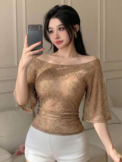 Top à fleurs mignonne avec décoration de strass pour femmes, ajusté avec élégance pour les fêtes, mariages, bals de promo, trajets, Top en mousseline à manches évasées pour l'été