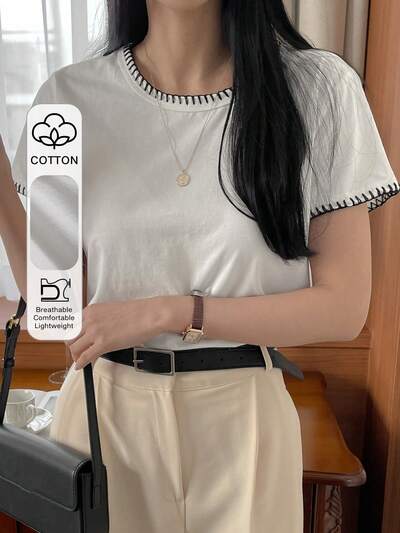 T-shirt femme à manches courtes coupe slim de couleur unie avec encolure ronde, vêtements d'été et de rentrée scolaire-60%