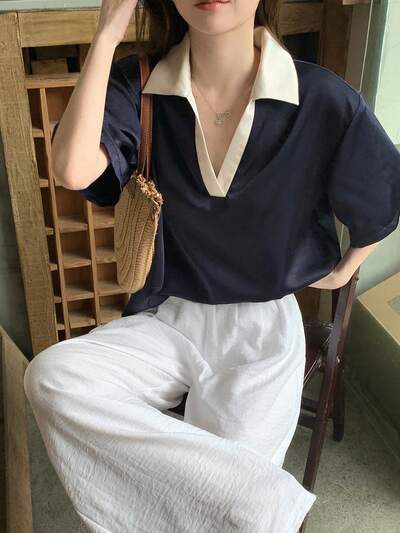 Chemise d'été pour femmes à col rabattu, avec bloc de couleurs et manches courtes
