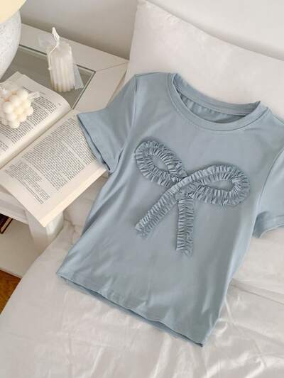 T-shirt décontracté pour femmes, couleur unie avec décoration nœud, été-44%