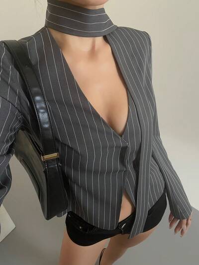 Chemise élégante de bureau pour dame avec col en V, rayures et taille cintrée
