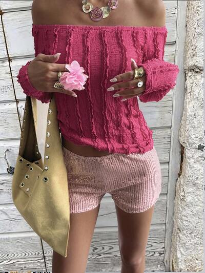 Top moulant fuchsia à épaules dénudées, t-shirt court à manches longues plissé et rayé, texture décontractée pour festival de musique et vacances, printemps/été Y2k