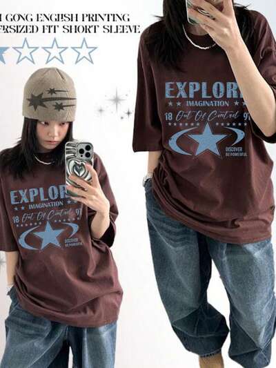 T-shirt ample à col rond, imprimé de lettres et couleurs contrastées, manches courtes. T-shirt graphique oversize, printemps, été. Pour enseignante