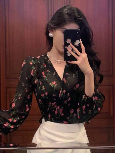 Chemise à col en V imprimée tout-sur-tout pour femmes, hauts à manches longues, volants, vêtements d'automne pour femmes, tenues de vacances pour femmes bohèmes