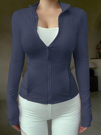 Veste ajustée à manches longues, col montant élastique, couleur unie. Décontractée pour le sport, pour le printemps et l'automne.-46%