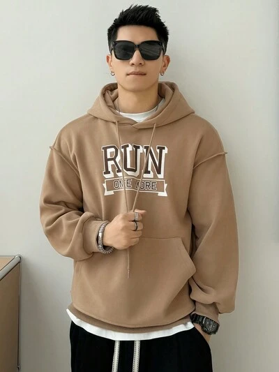 Felpa con cappuccio da uomo con stampa a lettere, spalle a caduta e coulisse, abbigliamento autunnale-60%
