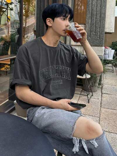 maglietta girocollo a maniche corte da uomo, grigia, con ricamo a lettere, estiva-67%