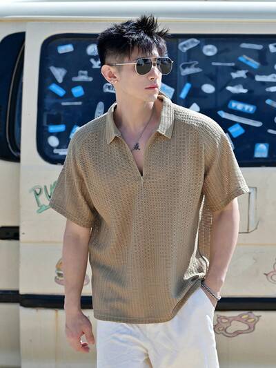 Camicia polo casual da uomo per l'estate, di colore unito, in tessuto strutturato, con mezza chiusura lampo-68%