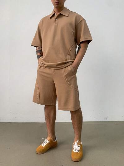 Set estivo da uomo con polo a maniche corte e pantaloncini in tessuto strutturato di colore uniforme-23%