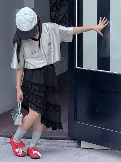Set 2 pezzi di top a maniche corte con collo rotondo e stampa a lettera e gonna per ragazze adolescenti, minimalista