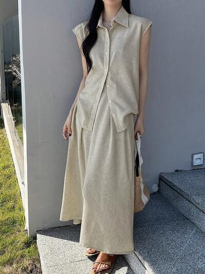 Set da 2 pezzi in lino vintage minimalista per primavera ed estate, camicia senza maniche larga e gonna lunga, stile moda-27%