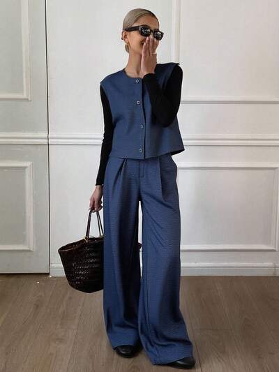 Set casual da 2 pezzi da donna, top senza maniche con bottoni frontali e pantaloni, tinta unita