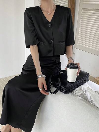 Set da 2 pezzi: Camicia corta e gonna tinta unita da donna, abbigliamento autunnale