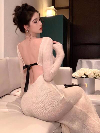 Elegante abito-maglione da donna con schiena scoperta e lacci, adatto per l'autunno/inverno