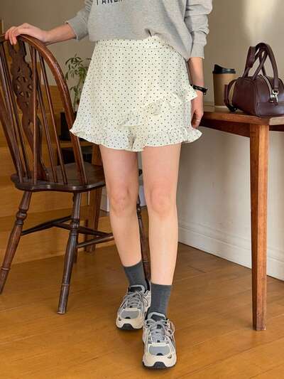 Shorts casual ampi da donna con orlo a volant a pois-37%