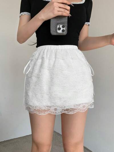 Gonna a-line con patchwork di pizzo e fiocco per donna-60%