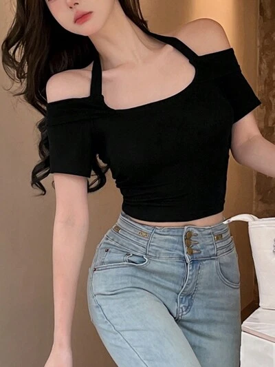 Top corto da donna, aderente, con scollo ad alette e maniche corte, adatto per uscire