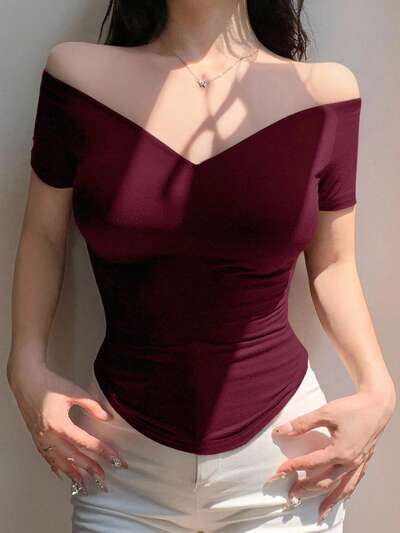 1 pezzo Maglietta aderente a maniche corte con spalle scoperte, di colore unito, sexy, estiva, top con spalle scoperte, abbigliamento per il ritorno a scuola