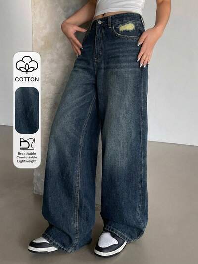 Jeans larghi a gamba dritta con decorazioni consumate, stile casual da strada, per donna taglia alta