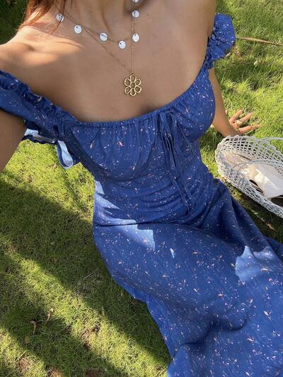 Abito midi da donna con scollo quadrato, maniche a petalo rosso e stampa floreale ditsy, stile bohémien
