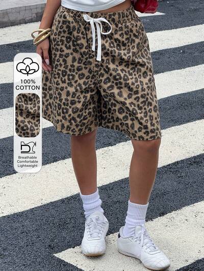 Shorts di jeans estivi da donna con lacci e stampa leopardata