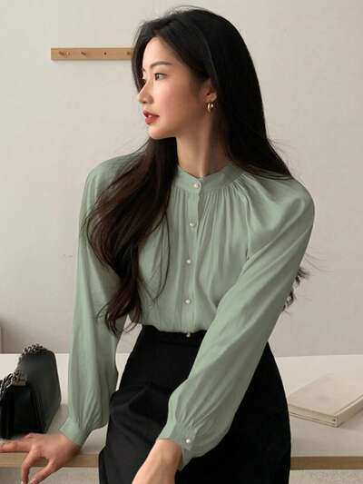 Camicetta donna a maniche a lanterna con bottoni, colore unito, per la primavera. Top a maniche lunghe per l'autunno