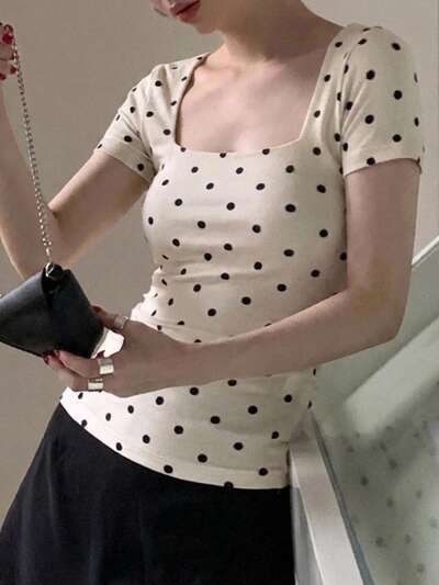 Maglietta aderente a maniche corte con scollo tondo e stampa a pois con arricciature