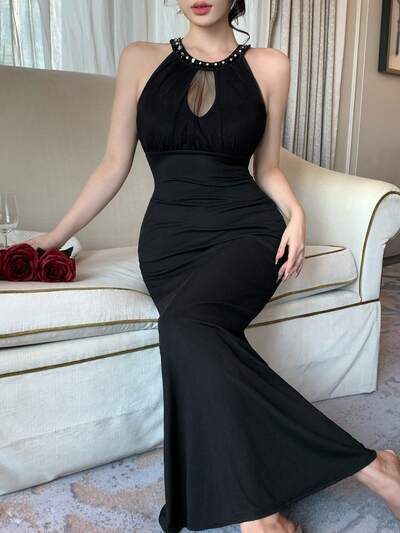 Abito da donna senza maniche con vita stretta e decorazioni in paillettes, abito elegante da cocktail