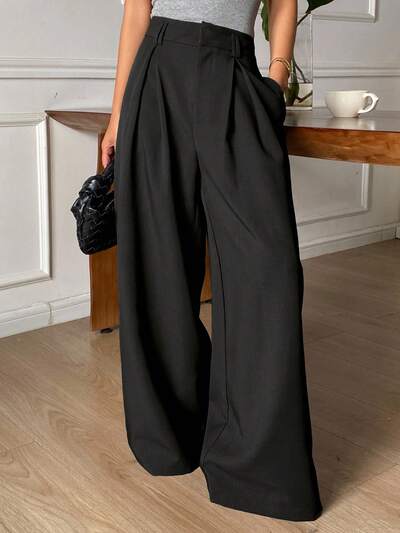 Pantaloni larghi plissettati da donna, pantaloni eleganti in colore unito morbidi per primavera e autunno-33%