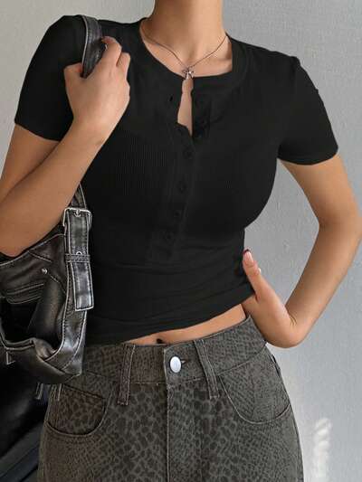 Maglietta casual estiva da donna con scollo a barca, chiusura anteriore semi-aperta, aderente, sexy, maniche corte-46%