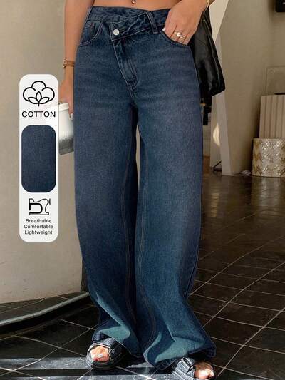 Jeans casual dritti con patta obliqua ampia, pantaloni rilassati da donna, abbigliamento casual di strada-38%
