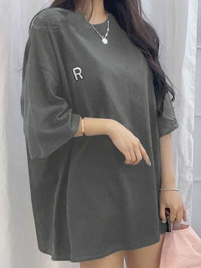 T-shirt casual oversize da donna con stampa a lettere, scollo tondo, spalle cadenti, stile preppy, per l'estate