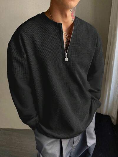 Maglietta da uomo con collo a chiusura lampo 1/3, in tessuto strutturato, per l'autunno