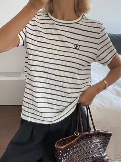 Maglietta casual a girocollo con blocchi di colore a contrasto, a righe bianche e nere, con ricamo a cuore, adatta per festival musicali, San Valentino, matrimoni, strada, spiaggia, primavera ed estate