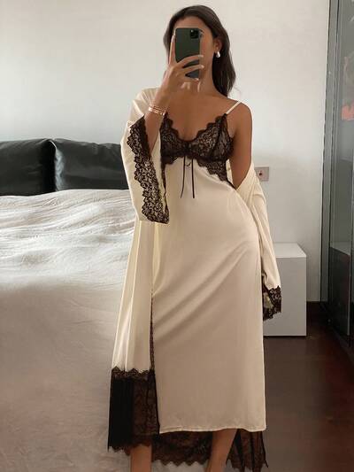 Set pigiama da donna: vestaglia con cintura e contrasto di colore con pizzo, e camicia da notte a sottoveste, abbigliamento autunno inverno