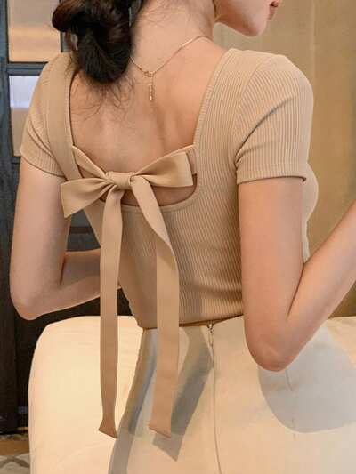 Maglietta estiva da donna con schiena scoperta, lacci e fiocco, sexy e casual, a maniche corte