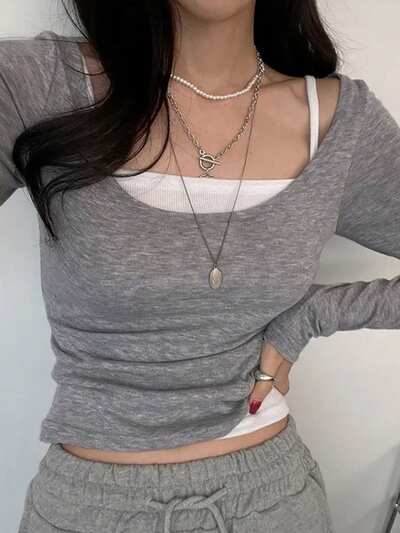 2 pezzi Set di magliette casual a blocchi di colore per donna, capi autunnali, maglie a maniche lunghe per donna-49%