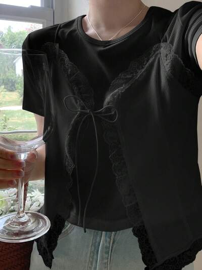 Maglietta da donna con scollo tondo, maniche corte e inserti in pizzo, effetto 2-in-1