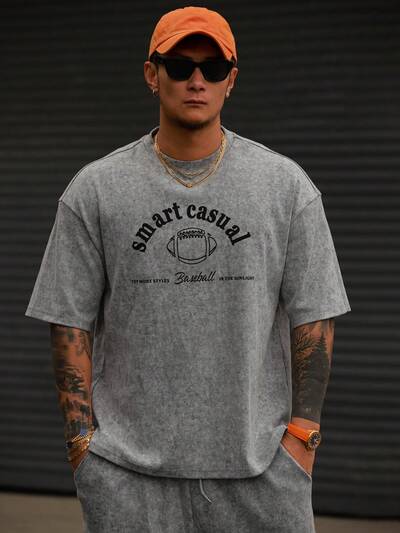 メンズ レタープリント グレー 半袖Tシャツ ショーツ セット、夏-64%