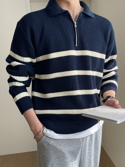 メンズ ストライプ柄 ポロネック 秋セーター ティーなし クォータージップ-68%
