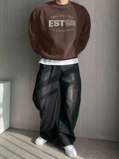 スプリング&オータム メンズカジュアル レター プリント ドロップショルダー 長袖 ドローストリング パーカー-37%