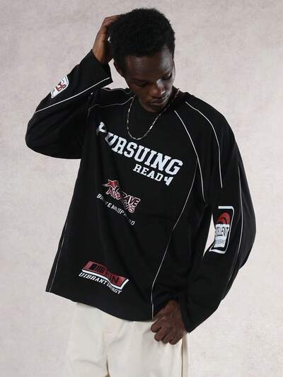 メンズ レター プリント ブラック ラウンドネック デコラティブ ストライプ Tシャツ 秋-67%