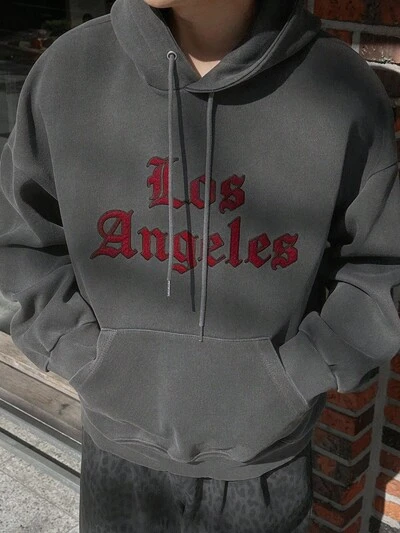 メンズ ゴシック文字刺繍デザイン サーマルライニング パーカー、チャコールグレー、秋冬-65%