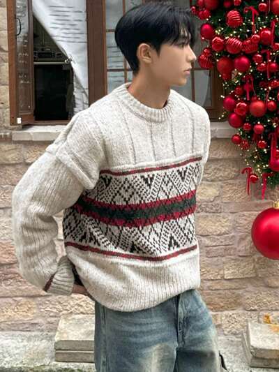 メンズ テクスチャード ジャカード クリスマスパターン クルーネックセーター、秋冬-55%