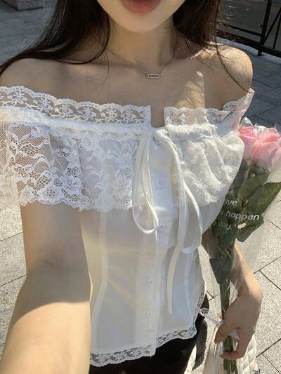レース パッチワーク オフショルダー 半袖 カジュアルブラウス レディース、春夏-45%