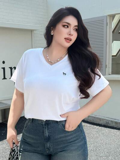 Dazy Plus 刺繍装飾 Vネック ルーズ ホワイト 半袖Tシャツ-43%